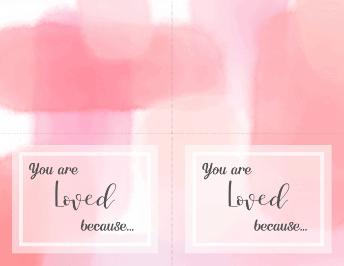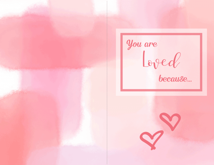 If you click on the link above, you’ll get the PDF version of the Valentines Card Printable which you’ll see doesn’t have the dotted lines on it like in the image above to make your finished card look as professional as possible. Just fold your paper in half each way where the lines are on the image above. Then just cut, as neatly as you can along the fold which goes from top to bottom, between the two ‘You are loved because…’ images.