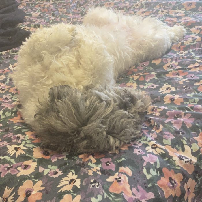 He lays on the bed behind me all day so every now and again, I just turn around and get a doggy cuddle.