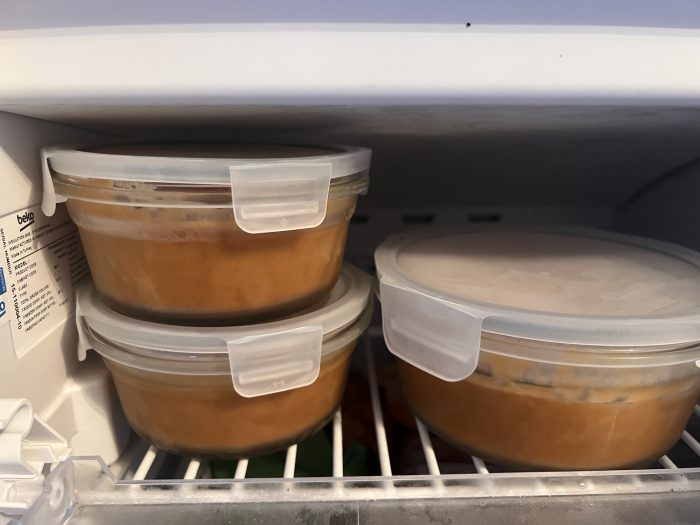 We decided to start from scratch and bought a set of glass containers from Costco for £20 – this set includes 13 (I think) different sizes of both rectangular and circular tubs with lids that clip on securely. They all stack together really well so they take up less space and they’re both freezable and safe for use in the oven and in the microwave so they’re perfect for my batch cooking plans.