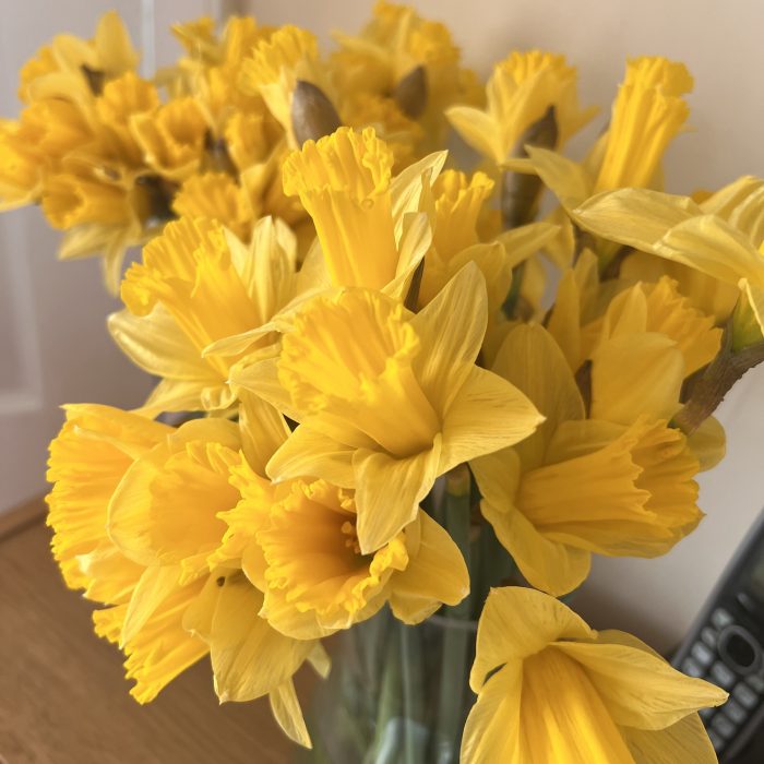 It’s actually 7 or 8 normal sized bunches of daffs bunched into one and they bloomed so beautifully after just one night in water. This is what I came downstairs to the morning after…