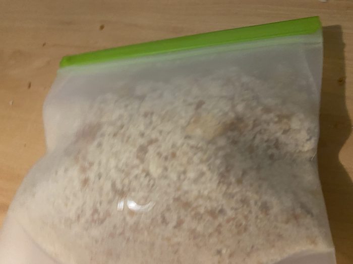 I have a cute little hand blender so if I ever have any leftover bread from a loaf then I pop it in the blender and make breadcrumbs to use for things like chicken kievs and fishcakes. I keep them in a bag in the freezer so they’re ready when I need them. This week, I bought a baguette from the shop reduced to 9p – some of which I used to go with some homemade soup for lunch the next day and the rest I blended and added to my breadcrumb bag.