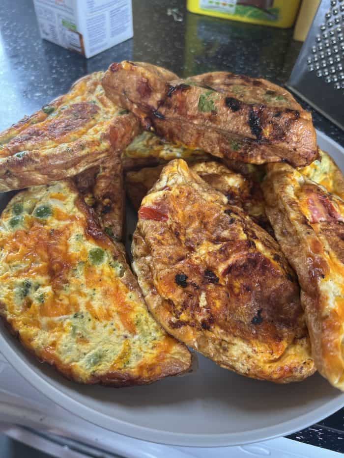 Omelettes freeze well as I know from my mini omelettes that I used to make in the oven so my idea of making a batch this morning was to use up some leftovers and some stuff from the fridge that needed using up and to save even more time through the week so I can enjoy a yummy lunch which will still leave me time to go for a walk or have a nap if I’m a bit tired.