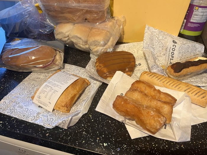 £3.29 for a Cooplands bag which contained two bags of breadbuns, a steak slice, three yum yums, a sausage roll, an eclair, some kind of caramel swirl and a corned beef salad sandwich.