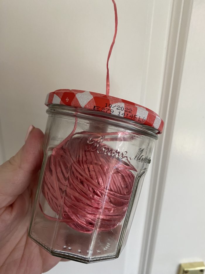 I shared a couple of ways I use the empty jars a little while ago but this week I made one into a string dispenser by hammering a nail gently through the centre of the lid.