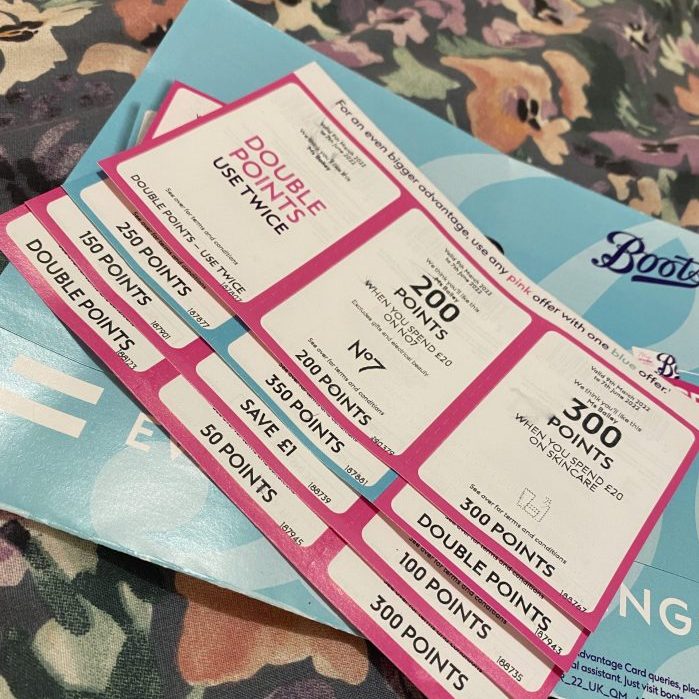 I don’t use them all as I’m not a big spender in Boots but I do buy something from in there regularly which are good value so I try and buy them all at once where I can to get the extra points for a spend of a certain value. Right now, I have a triple points offer on for March which I loaded to my card from the app, the skincare range I buy (the Boots brand which I shared a couple of weeks ago is on triple points in my app and there’s 350 points if I spend £35 on top of these vouchers I just got through the post so I can boost my points total this month.