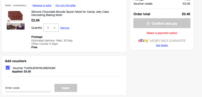 4) I popped on eBay to search for some new dining chairs and noticed I’d been given another one of those £5 off vouchers. I checked the minimum spend and it was £5.01 so I thought I’d buy a couple of the things in my basket on there which totalled £5.48 so I literally only paid 48p.