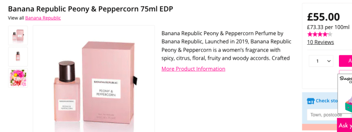 2) I ran out of my favourite ‘everyday’ perfume this week – it’s the Banana Republic Peony and Peppercorn which I usually manage to find on offer somewhere for around the £25 mark. It’s currently selling for £55 in Superdrug so I suspect it’s going to be on offer in there at some point soon with them claiming 50% off or something ridiculous like that but honestly, it is usually available somewhere for £25.