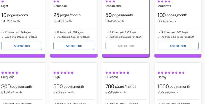We’re on the 50 pages a month plan which costs us £4.49 but we’ve only just upped from the £1.79 plan as we rarely used it for ages. Between homework, mortgage applications and travel planning we’ve started to use it more and more so I upped our package to the one we’re on now and it’s just the right amount for us at the moment.