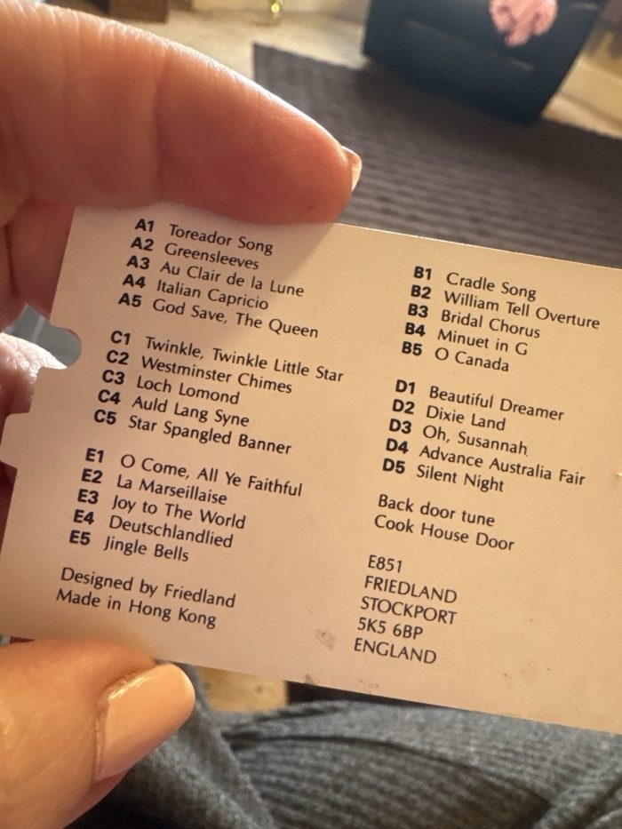 Inside the hall, we found an old 1970s Friedland door chime which, when we opened it up, had the original card inside listing all of the tunes you could choose from…