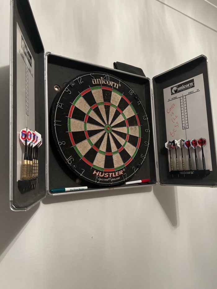 I’ve been eyeing up this plain white wall with a vision of a lovely piece of artwork hanging there but this week, we put up a dartboard that was gathering dust (and rust) in the shed in the back garden. This is a much better option that something that just looks pretty if you ask me!
