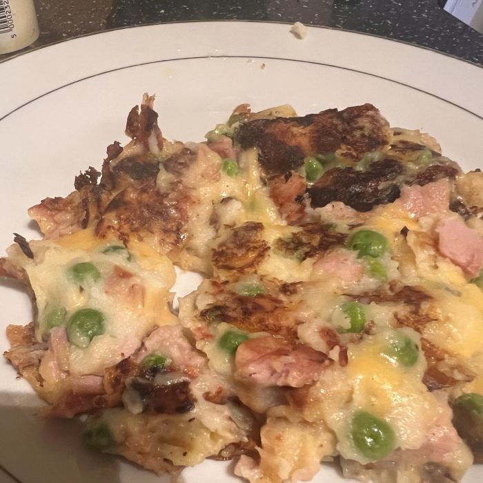 This is our version of bubble and squeak from Boxing Day – mash, peas, gammon and grated cheese! This was an amazing way to use up the mash mountain we were left with!