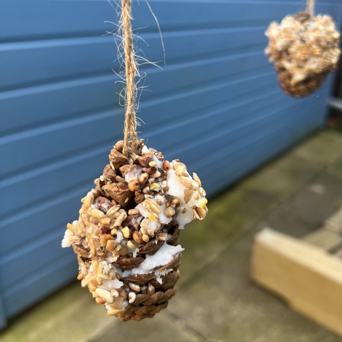 1) This week we made good use of our pine cones by making them into Bird feeders… I bought some cheap lard and literally just spooned it onto the pine cones before giving them a roll in the wild bird seed that we bought a while ago.