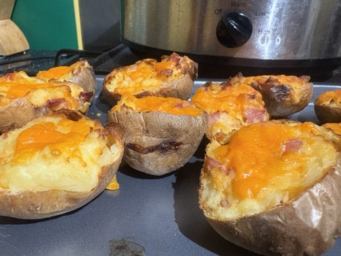 So I roasted them and when they were done and cooled a bit, I scooped out the potato and mashed it with grated cheese and some leftover gammon and spooned the potato mix back into the skins and popped them in the air fryer for a few minutes to crisp up.