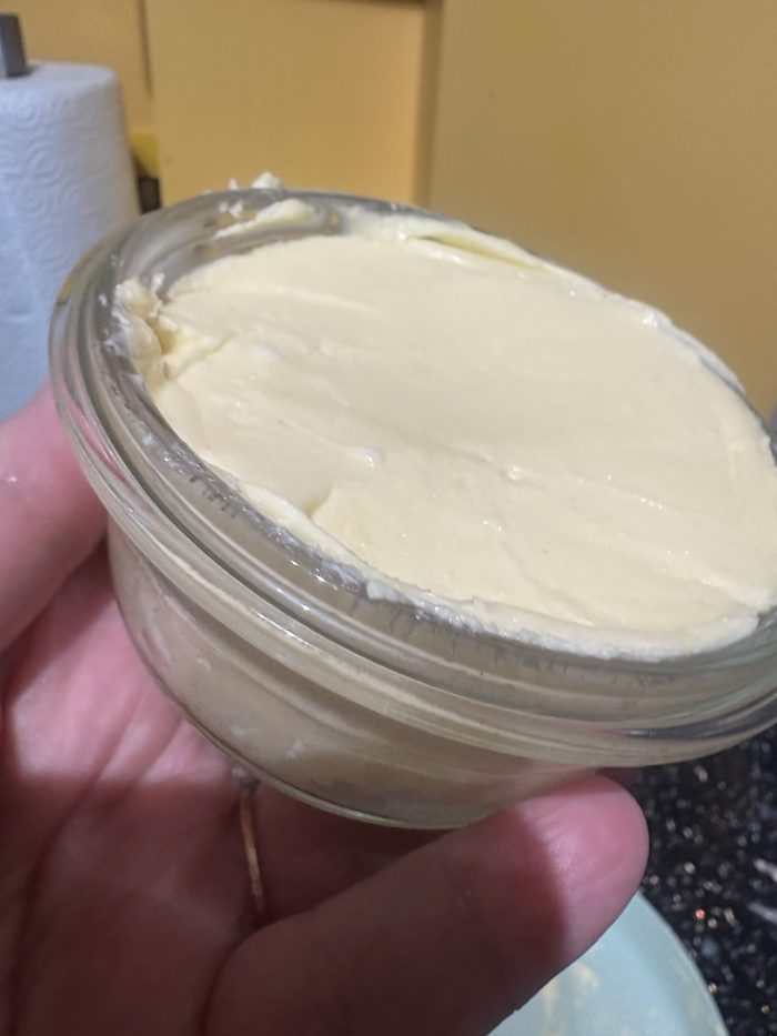 I’ve shared in the past how to make butter and I just made it the same way that I always do other than I added some garlic granules to the mix. I would have used fresh garlic but I have no idea where our garlic press is and I didn’t want garlicky hands so I took the cheats way out.