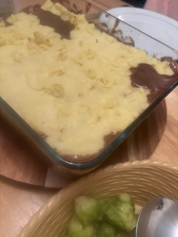 I didn’t have any cheese to add to the top of it so it looks a bit anaemic but it tasted lovely and did four of us for tea with some extra veggies and a few Yorkshire puds on the side and there were two large portions leftover which did the next two days worth of lunches for my partner at work.