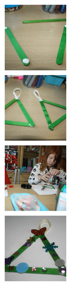 They’re just three lolly sticks, glued together in a triangle with some ribbon glued on to the top and some sparkly bits glued around it randomly. They were really easy, took about five minutes to make from start to finish and they look great on the tree!
