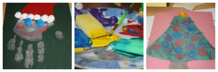 The next cards we made were Santa’s made from Miss Frugal’s handprint – we used silver as we had no white but white would have been loads better I think.