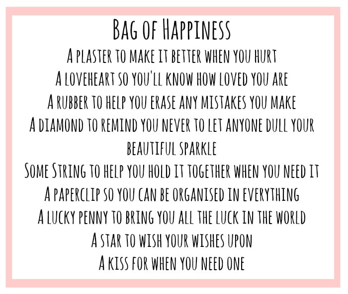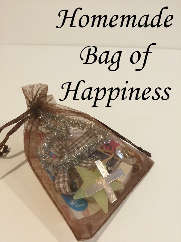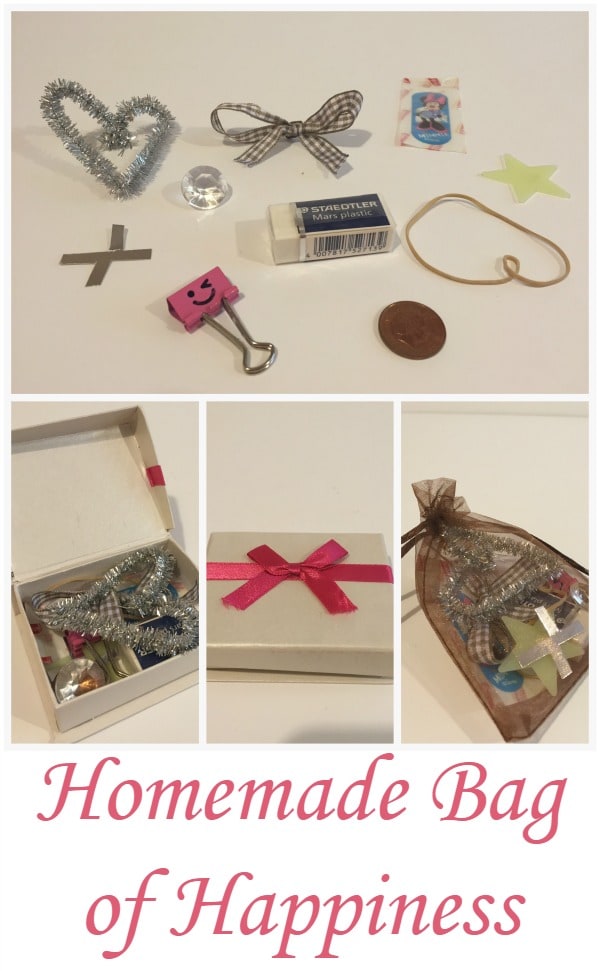 It’s a a Bag of Happiness and it’s filled with little things that are symbolic of what you want them to represent- here’s what’s in the bag I’ve made Miss Frugal….