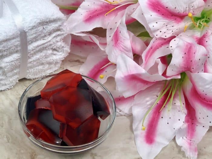 Remember my homemade pink prosecco gummy bear jelly sweets? They taught me a valuable lesson in life – that you can add gelatin (or vege-gel) to pretty much everything and you’ll end up with a jelly. Sooooo, I thought we could investigate making some homemade bath jelly and the results were fab!