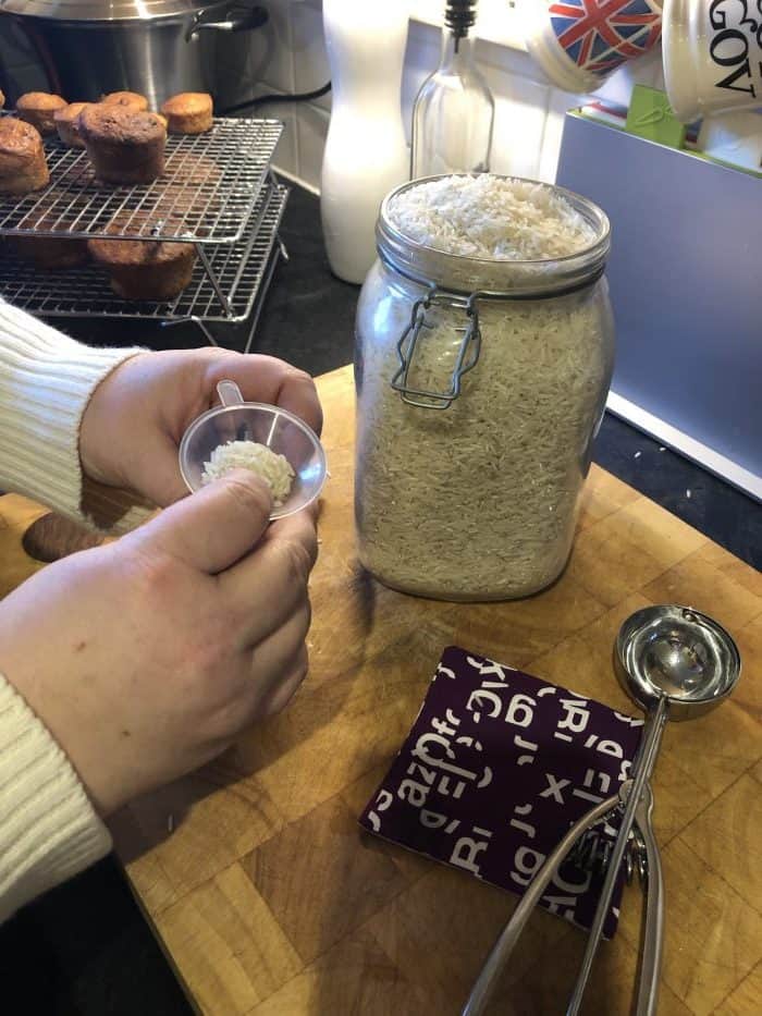 Step 6 – Using a little funnel made of paper if you don’t have a plastic one, spoon in a couple of spoonfuls of rice so the bag is about half full.