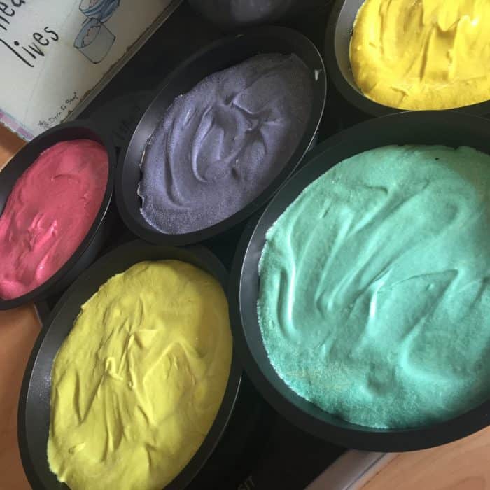 But the idea of making a rainbow layer Birthday cake was in my head by that point so I decided to give it a go using a much more simplified recipe – a scaled up version of my Nan’s old faithful sponge cake recipe.