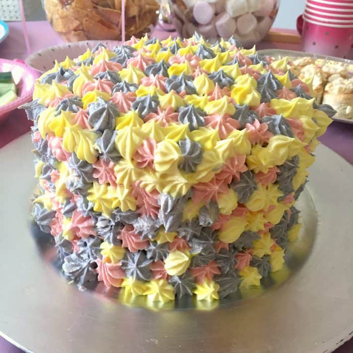 - Now comes the fun part, using a star shaped piping nozzle (like this one) and, if you’re anything like me, some disposable icing bags (like these but mine are from Asda I think), you can use one colour at a time to piple little stars all around the cake. I just did random stars dotted about in the first two colours and then filled the gaps with stars with the last colour. I started with the pink, then the blue and then the yellow and I think you can see from the picture that there’s more yellow because that was the last colour so I used it to fill all the gaps in. I’d finish with your favourite colour if I were you as that will be the predominant colour in the icing.