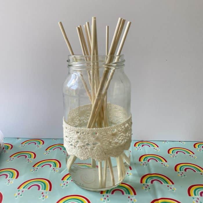 - Pop between 10 and 15 of your reed diffuser sticks in your jar.