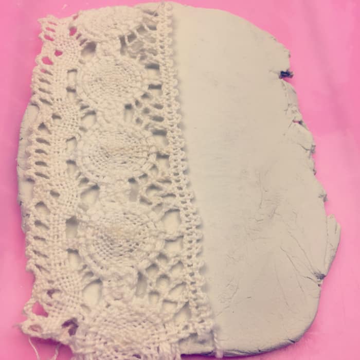 Next up, she pressed in some scraps of lace into the clay (luckily we were having a girly crafty afternoon at Jen’s who has the most well-stocked craft room ever) and used the rolling pin to gently press it down so the pattern of the lace was clearly imprinted onto the lace.