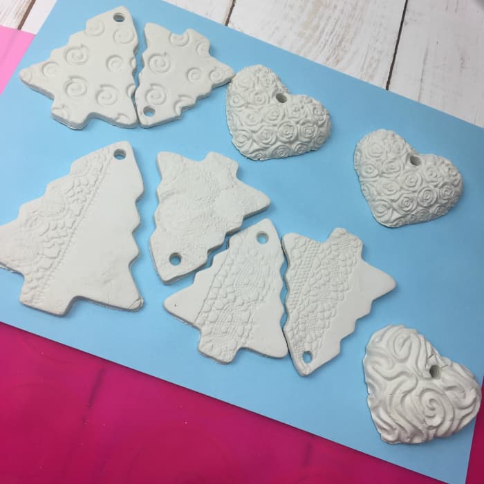 Once the lace was peeled off, the pattern of it was left on the clay! The first one she made went a bit wrong as she cut the shape out first and then pressed the lace in which meant that the shape of the decoration was distorted a little bit. Luckily with clay, you can literally just ball it back up again and start again.