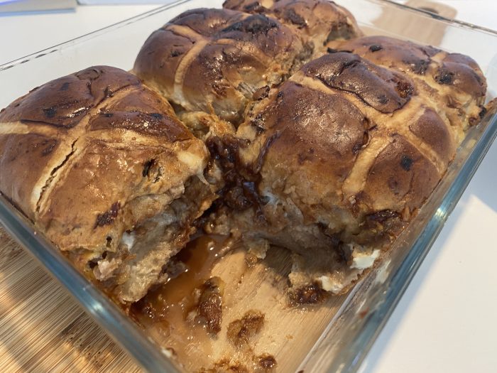 It was so nice that we bought a pack of hot cross buns that weekend just to make this with and that’s not the last time we’ve done that. My first thought when I saw the shops stocking up the shelves with Easter eggs right after Christmas was that it would soon be time for this again!