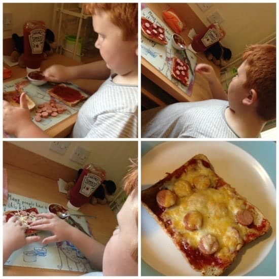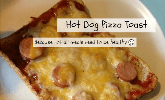 But because I didn’t have hot dog buns in, we decided to make pizza toast which is basically a slice of bread lightly toasted spread with a 50/50 mix of ketchup and tomato puree with sliced hot dogs and grated cheese on top. You then just need to grill it until the cheese is bubbling and voila, an unhealthy (but very tasty if you’re 9 and like hot dogs) snack for lunch!