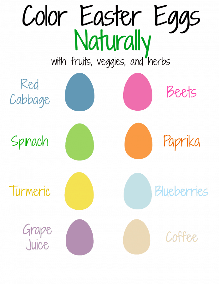 Blue: Use red cabbage to dye the eggs blue. Just cut 1/4 head of red cabbage into chunks and add to 4 cups of boiling water. Let cool to room temperature and remove cabbage with a slotted spoon. Add vinegar.