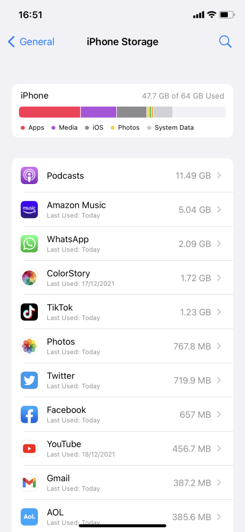 On my phone, if I go to >>Settings >>General >> iPhone Storage then I can see which apps are taking up all the storage on my phone which is where I usually start when deleting apps. Podcasts was taking up nearly 20% of my storage and I haven’t listened to one in about a year so I deleted the app giving me back 11.5GB.