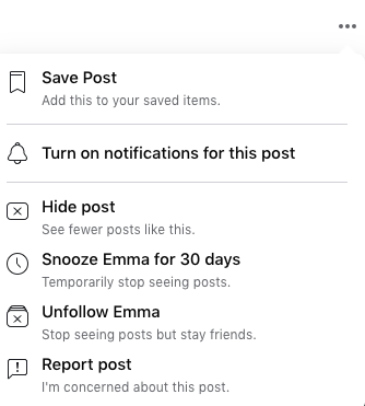 Easier said than done on Facebook where the chances are that if you un-friend someone then they’re going to notice at some point and wonder what they did. I just click on the three dots on the top right of their latest post or update and use the unfollow option so as far as they know, we’re still friends. This means that I just won’t see any of their posts in my feed without causing any drama.