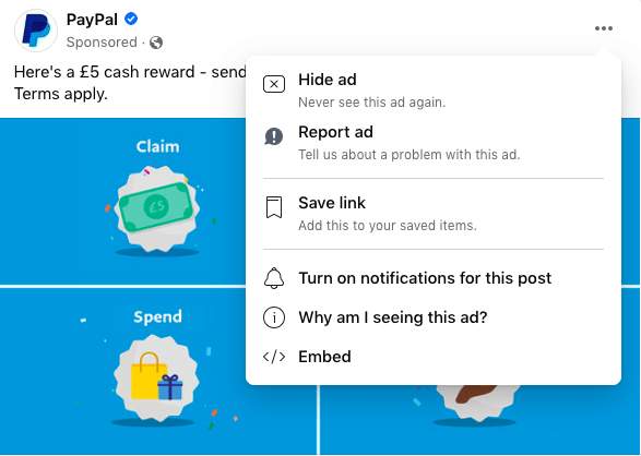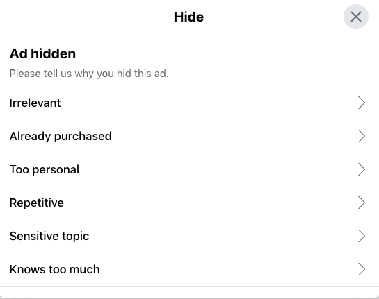 When you do hit Hide ad, you get some options to say what you don’t like about the ad. For example, I bought some bras online a couple of weeks ago from Ann Summers (honestly, really nice normal bras) and for a few days after, my Facebook feed looked like something from an adults-only channel with every third post being something naughty. Letting them know your ad preferences definitely works as I was back to PG-rated ads in no time. 😂