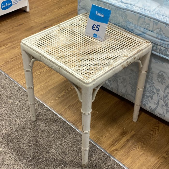 Look at this table that we spotted in our local charity shop! There were two of them and we stood and considered them for a good ten minutes planning what we could do to upcycle them as they were a perfect size for her living room which is huge. In the end, our plan was to give them a good clean, sand them down and then paint with a fresh white coat of paint with the intention of putting one in each corner of the room.