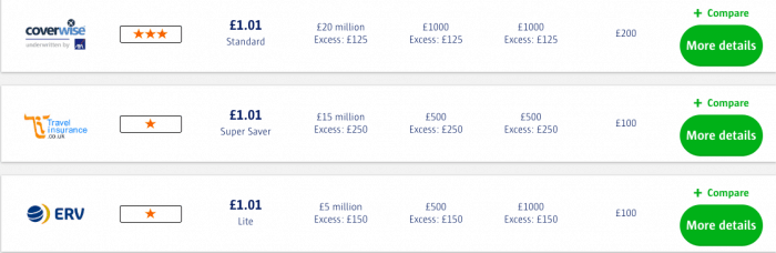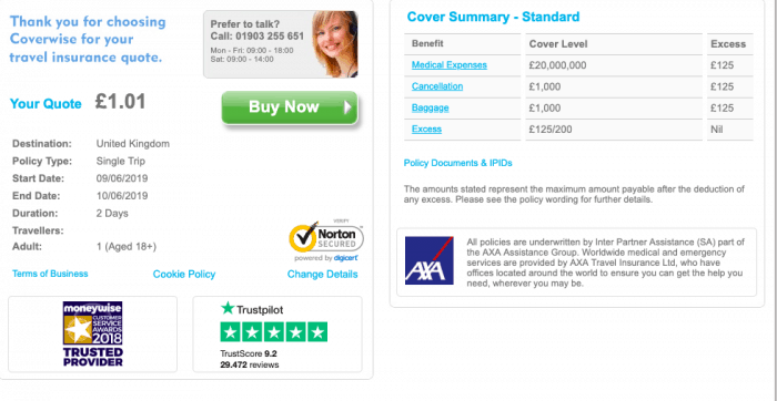 The three cheapest options were £1.01 (based on the date I checked – 9 June 2019) so I just picked the top one and selected ‘More Details’ at which point I was directed to the Coverwise site. It took me about a minute to fill in my details and purchase the policy although that’s because I wasn’t checking the details of the cover – it’s just the cheapest price I was looking at for the purposes of getting this deal. Usually, I’d never buy a policy without reading into it a bit more.