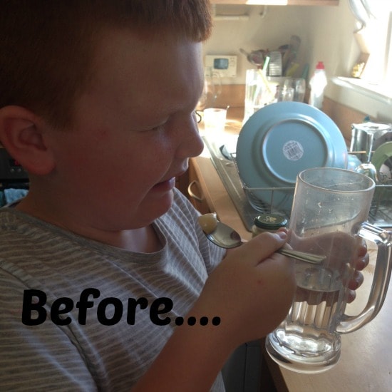The next day was typically my long day at work where I am in between 11 and 8 so I miss all meals but breakfast and I didn’t want Mr Frugal in charge of ‘Operation Try New Stuff’ do I decided we’d try one new thing at breakfast – honey! I would love him to like honey as I know that Manuka honey is great for your health but he’s always turned his nose up before, mainly due to the smell according to him. We put some honey on a spoon and armed him with a glass of water. Just look at his face! And this is before he tasted it: