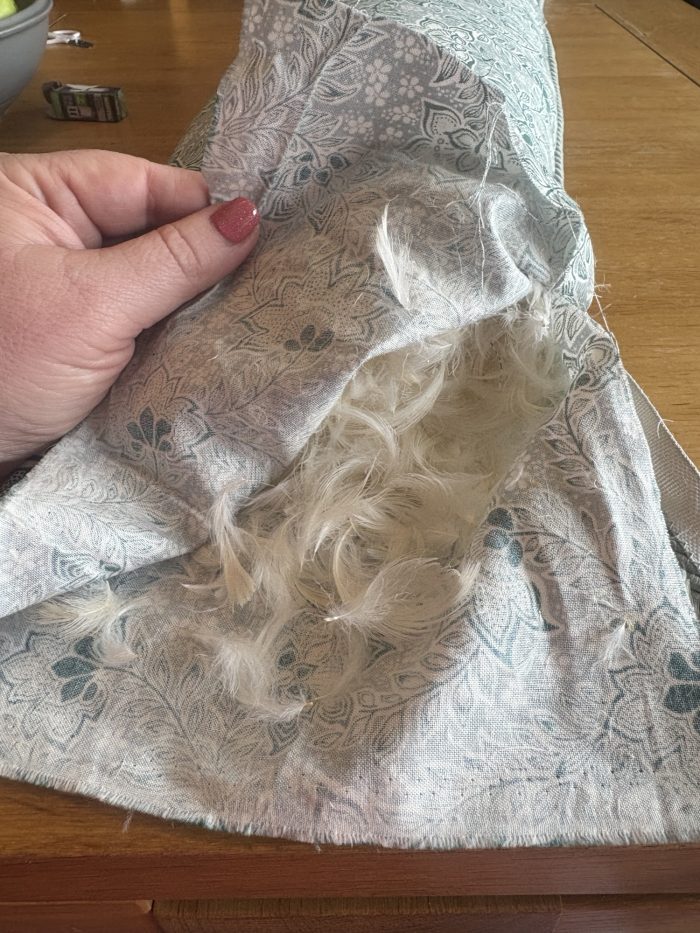 Fill your tube with your chosen filling. Rice or beans will give it weight so it stays put, while fabric scraps or old clothes are a free and eco-friendly option. I actually had a cushion that was no longer used so I swapped the cushion filling from there into my draught excluder. Make sure it’s full enough to block draughts but still flexible to move easily.