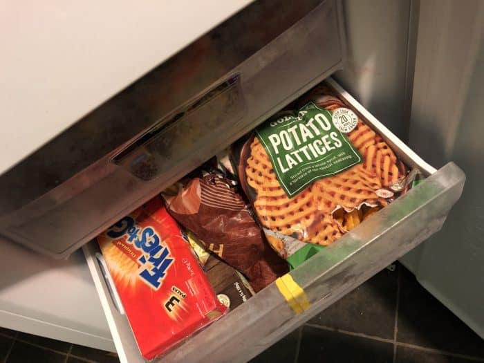 The top drawer here is filled with things we like to do for an ‘easy tea’ – things like burgers, chicken fingers and there’s a few shortcrust pies in there too I think. We snapped the pull-down front a few weeks after getting it but one day we’ll get it put back on!