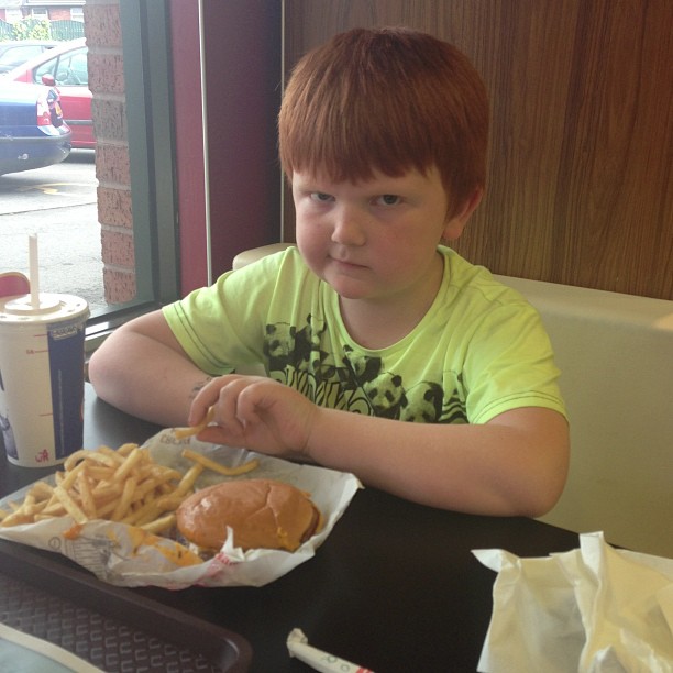 He really doesn't look happy, I'm sure the McDonalds trip made up for it though