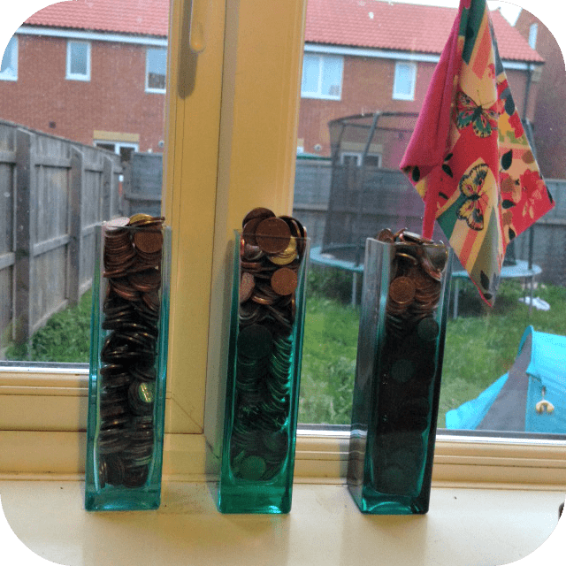 It didn’t take too long to fill the vases up as they’re not that big although it helps that both kids are like little magpies who seem to automatically find change on the floor when we’re out and about.