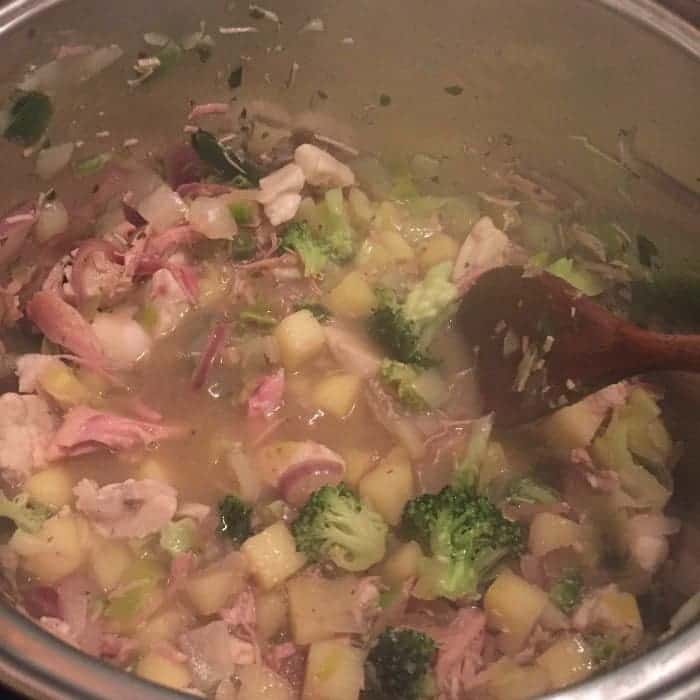 I quickly fried the onions and leeks in a little olive oil as they everything else I was adding was already cooked and just needed heating up. When they were softened I added the leftovers along with a stock cube and some water and let that heat through.