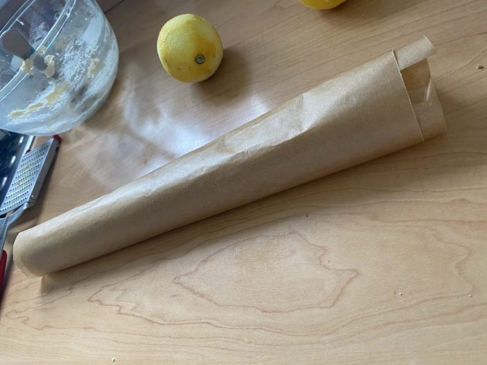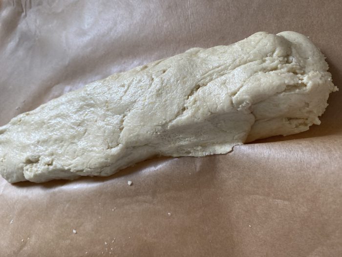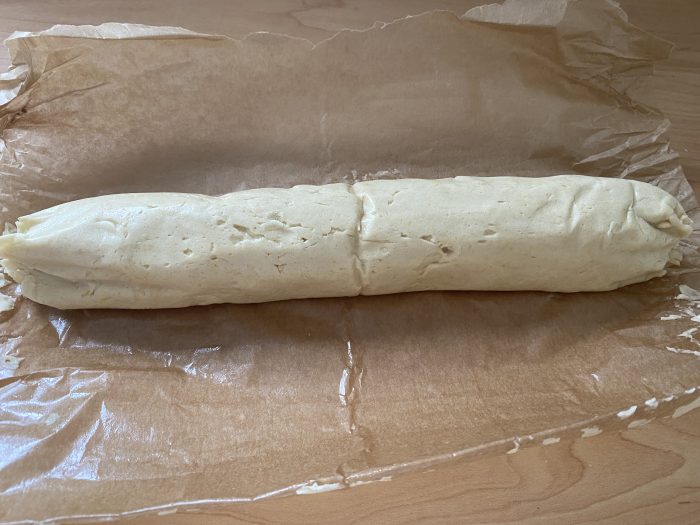 - Pop the dough onto a piece of baking paper and form it into a fat sausage shape. Roll it up in the baking paper and put it in the fridge for an hour to harden a bit.