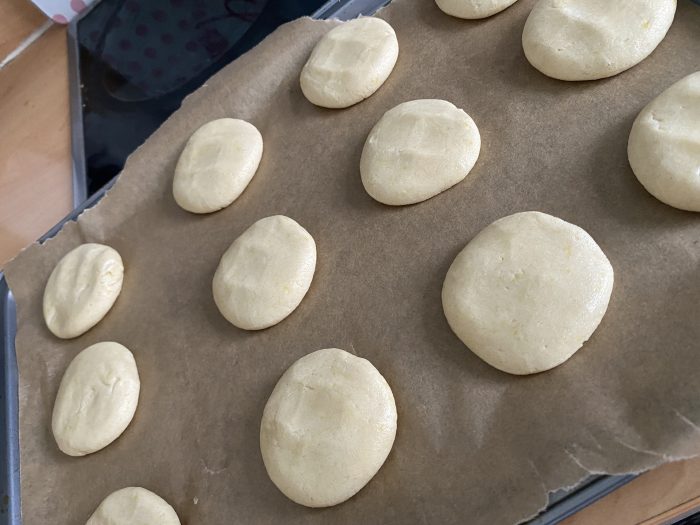 - Line a baking tray with a sheet of baking paper and cut your dough sausage into slices around 1cm thick and roll each one into a ball. Flatten them slightly onto the baking tray to make biscuit shapes. They don't spread too much so space them apart but I always manage to get 12 onto a baking tray so they don't need to be too far apart.
