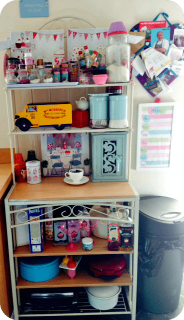 My counters seem a lot less cluttered as seeing the space that the microwave left inspired me to have a bit of a kitchen de-clutter. I’m still part way through it (I like to take things slowly ;-)) but already lots of gadgets and accumulated clutter have been re-housed which makes the kitchen look a lot more spacious already. In fact de-cluttering this shelving unit is on my to-do list for today: