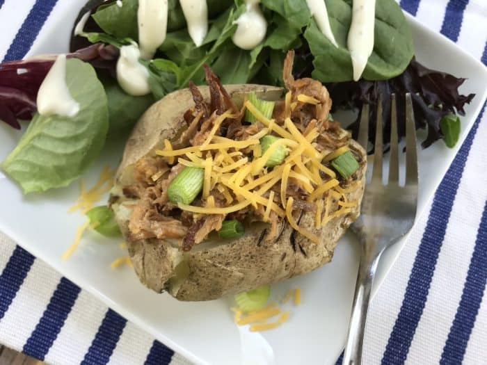 I considered making pulled pork quesadillas which we’ve had in the past and even thought about experimenting with some sort of pulled pork egg fried rice but I had some potatoes in to use up so I went with pulled pork jacket potatoes and salad.