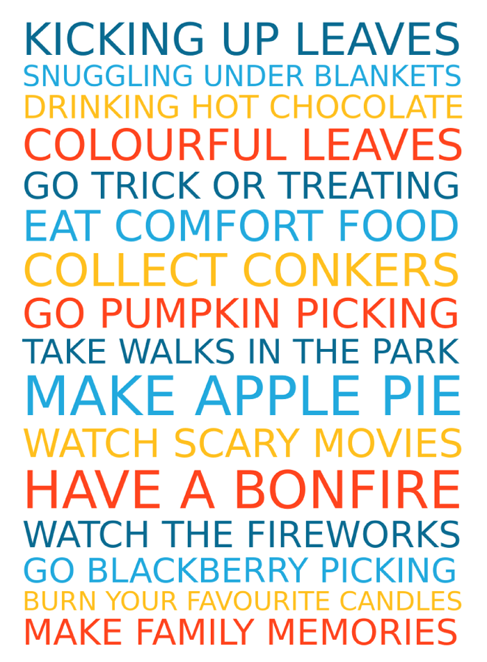 I’ve done a couple (I think) but as with most things in my life this year, I haven’t really done what I set out to do as things happened that changed my plans. But… I’ve decided I’m going to end the year on a high so I have three months left to share an idea a month. December will pretty much sort itself and I have an idea for November but for this month, I thought we could go all Autumn themed with an Autumn Family Favourites poster.