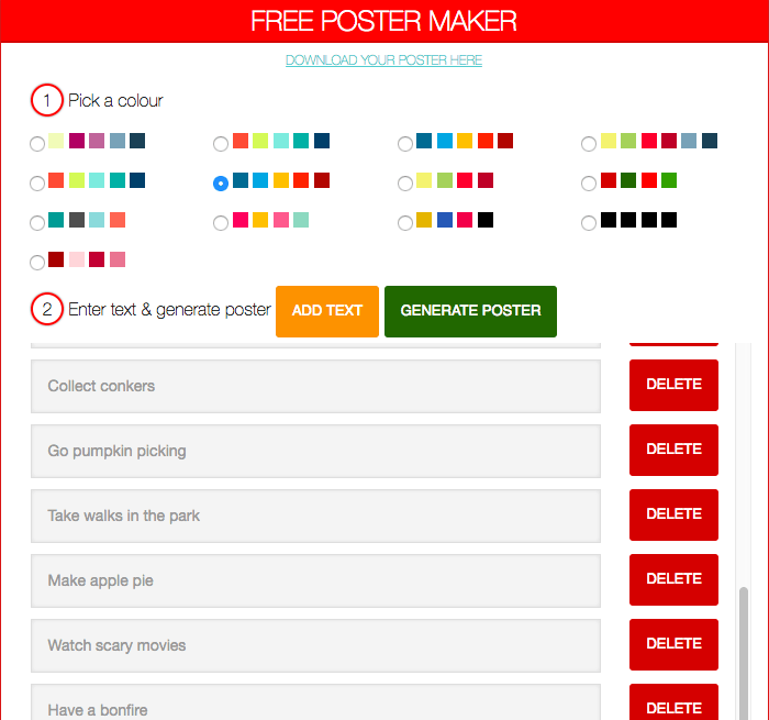 The poster maker is super easy to use – choose your colour scheme from the combinations available and then add your words into the boxes below. You need to be choosing short sentences with most around four or five words but with a couple of shorter ones to help the text size vary as it does in my poster – I reckon about 15 lines is an ideal size for an A4 poster size. When you’ve done that, just click on download poster and you’re good to go!