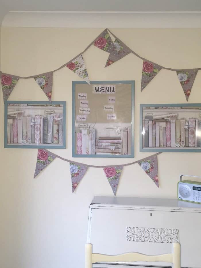 Last week when I was tidying the kitchen, it struck me I could do something with some wallpaper samples in the kitchen instead with some plain frames and that I could make it a corner of the kitchen that I loved as much as I used to love it when it was our art gallery wall. The frames covered most of the blu tac marks and I hung some bunting to cover the rest of it/